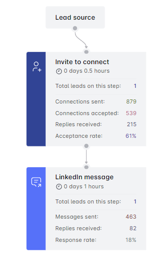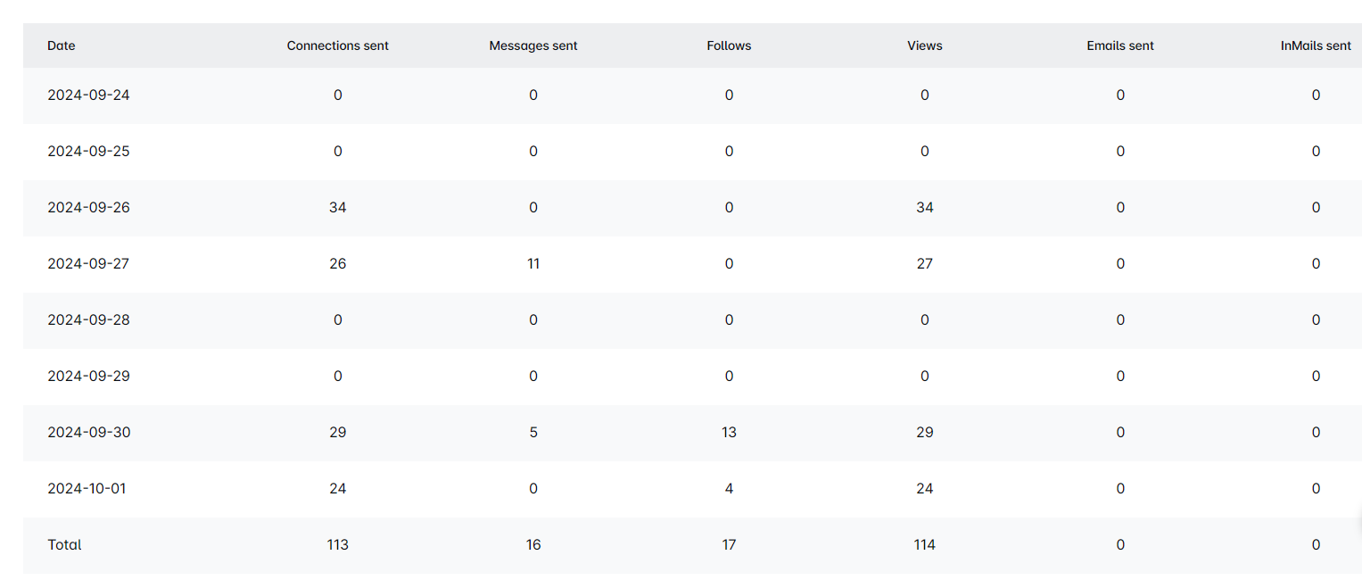 Scroll down for a detailed breakdown of each campaign step. See how many connections were sent, replies received, and emails/messages dispatched by Sizzling Digital. It varies based on your campaign type and the steps included. Easily spot where your leads stand in the campaign.