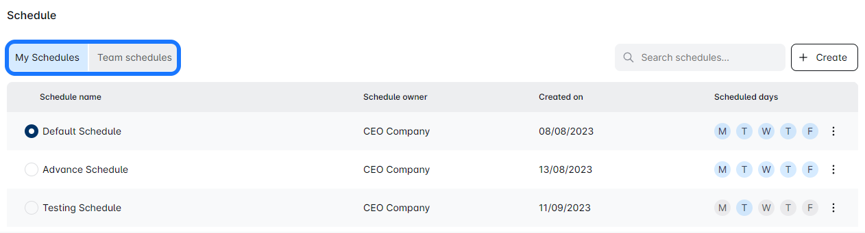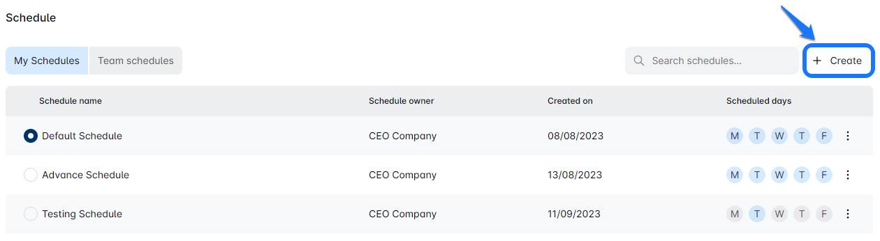 Click on the 'Create' button to open a new window for schedule creation.