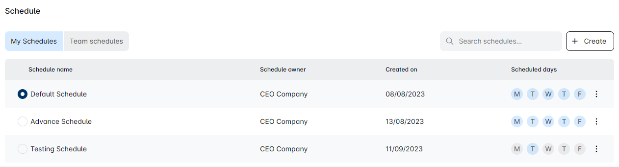 Within the three-dot menu, you can 'Duplicate for team', 'Edit schedule' or 'Delete' a schedule as needed.