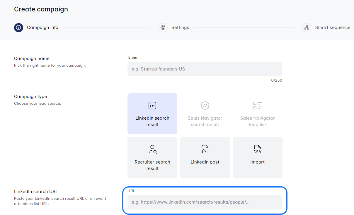 - Next, just copy-paste the URL with your new LinkedIn Search Results. Alternatively, you can import a CSV file.